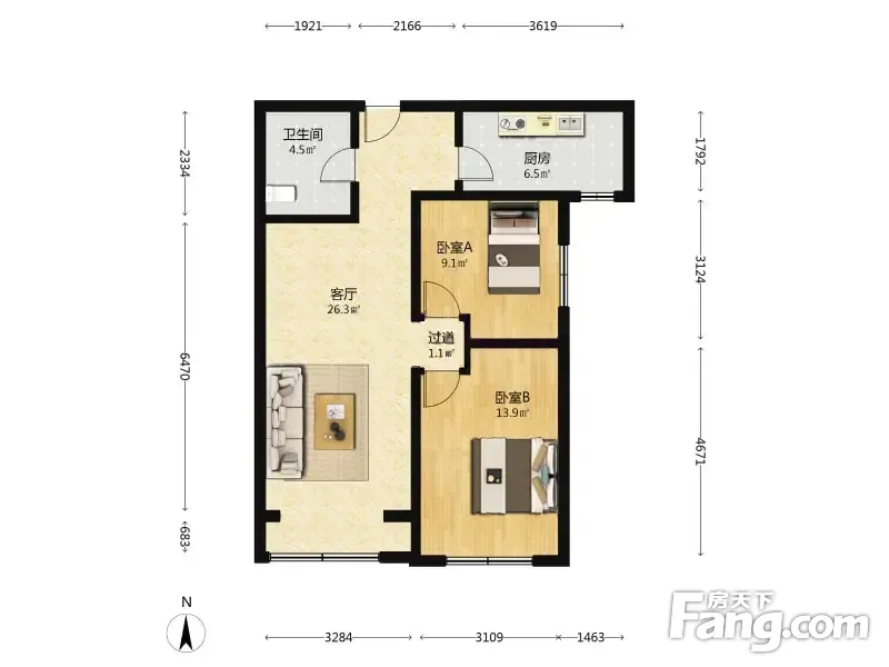 户型齐全,主打明厨,明卫,客厅朝南,全明格局二居