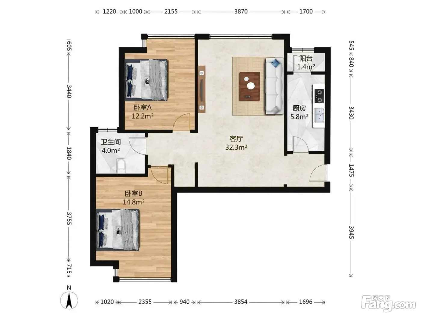 户型齐全,主打明厨,客厅朝南,双阳台三居