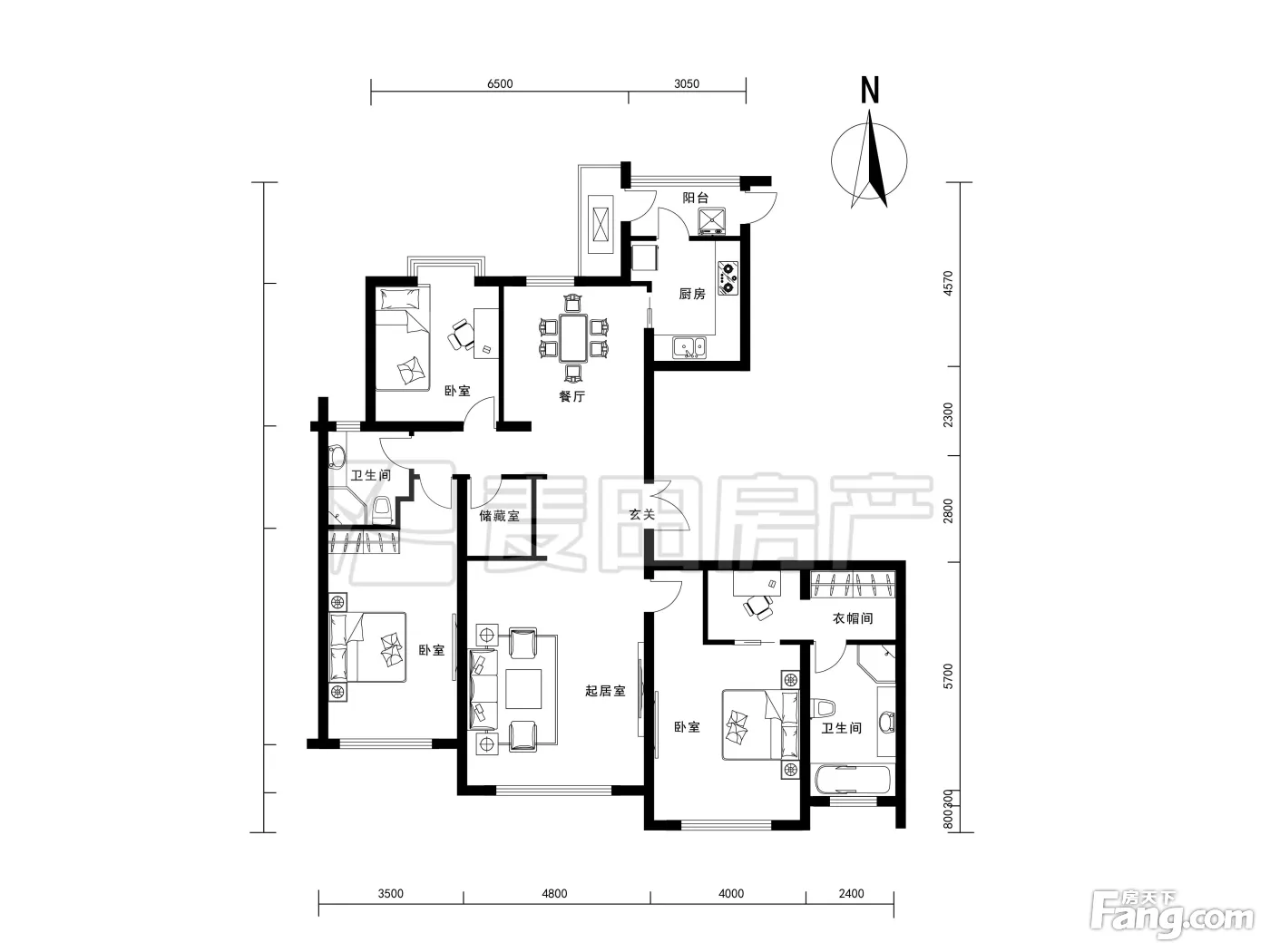 户型齐全,主打明卫,独立衣帽间,明厨,客厅朝南,双阳台三居