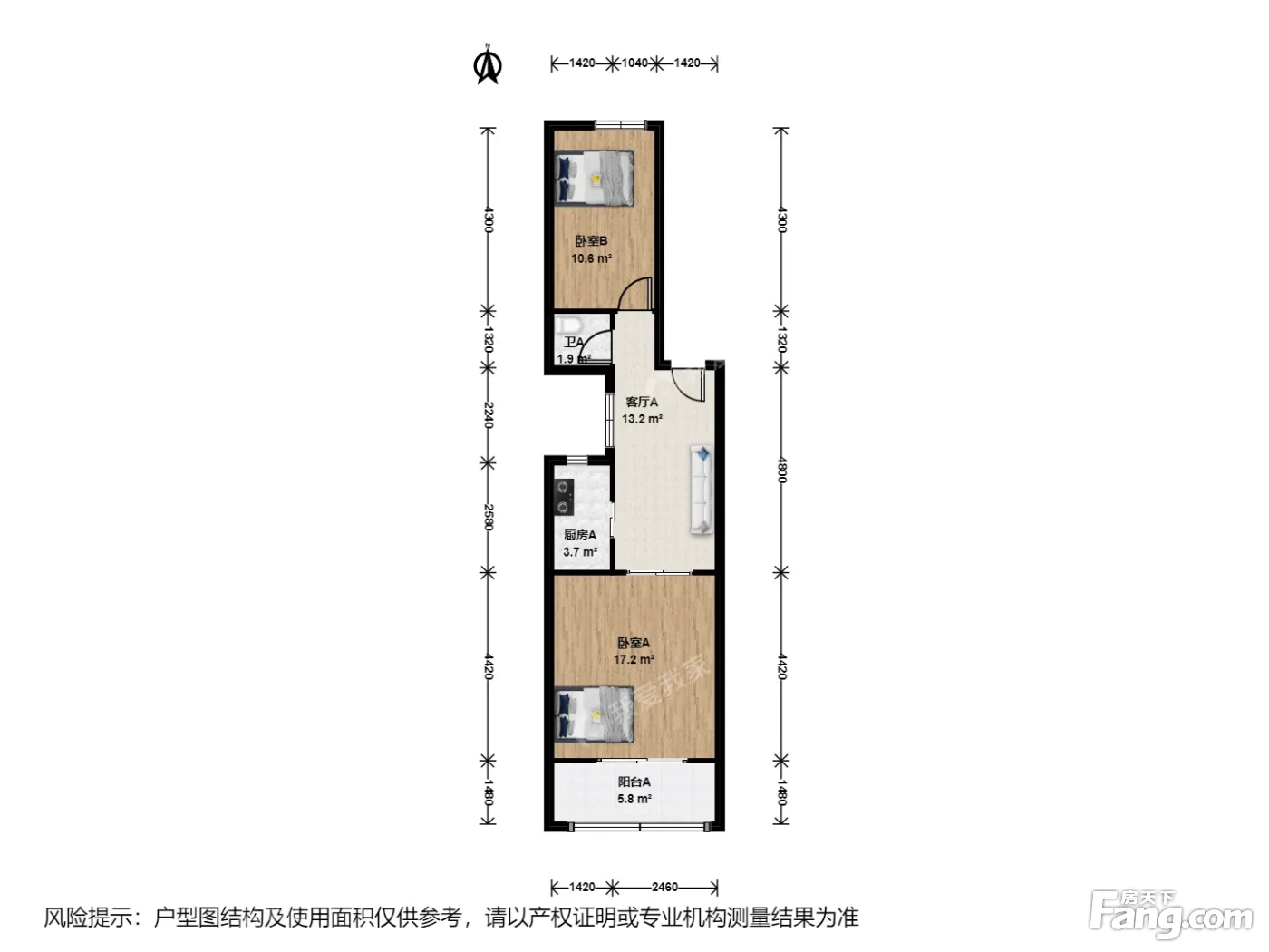 户型介绍:此房户型为2室1厅1卫,南北通透,主卧朝南带大阳台15平米,南边光线好没有遮挡,北边卧室对着小区里面,户型方正没有浪费面积