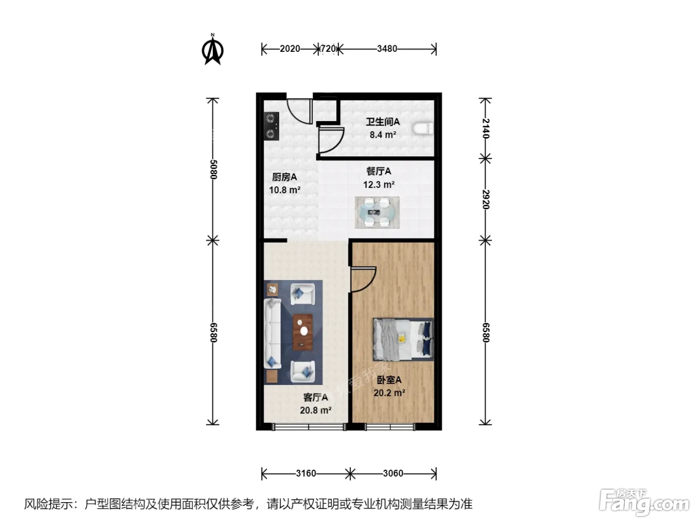 户型介绍:房子是南向一室两厅设计餐客分离,开放式厨房,户型方正,高,落地窗,南向窗前是小区园林,绿意怏然。