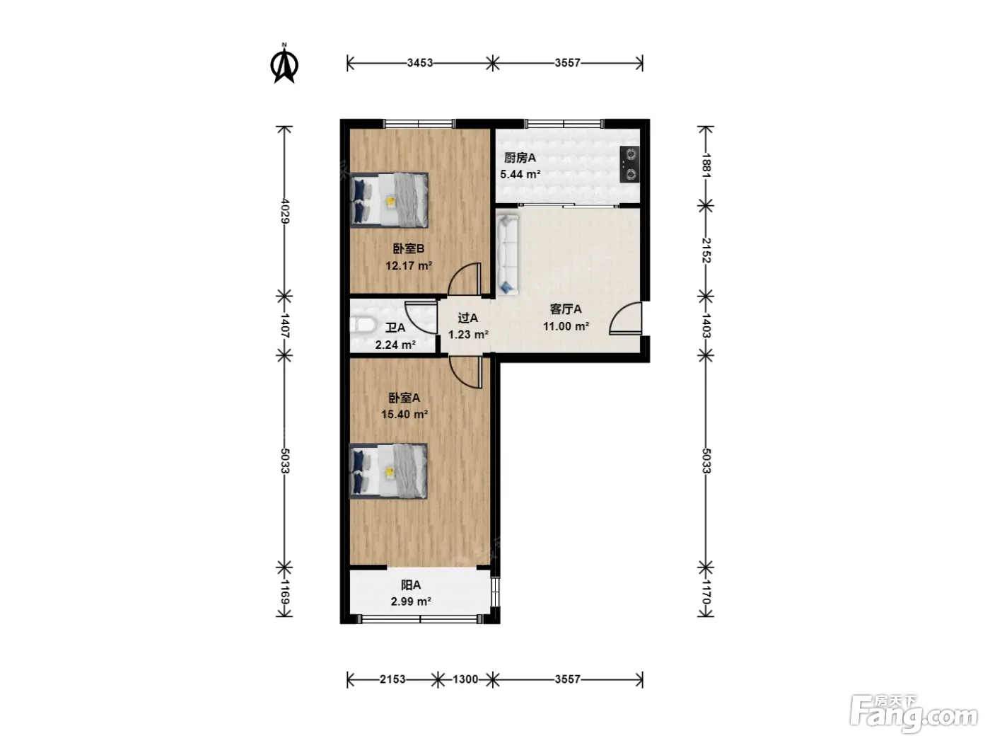 户型介绍:房子是正规两居室,进门左手边是客厅,与客厅连着是厨房,厨房改为开放式的客厅会更大一些;主卧室朝南带阳台,次卧室朝北,两卧室中间是卫生间,整体户型方正,基本没有浪费面积。
