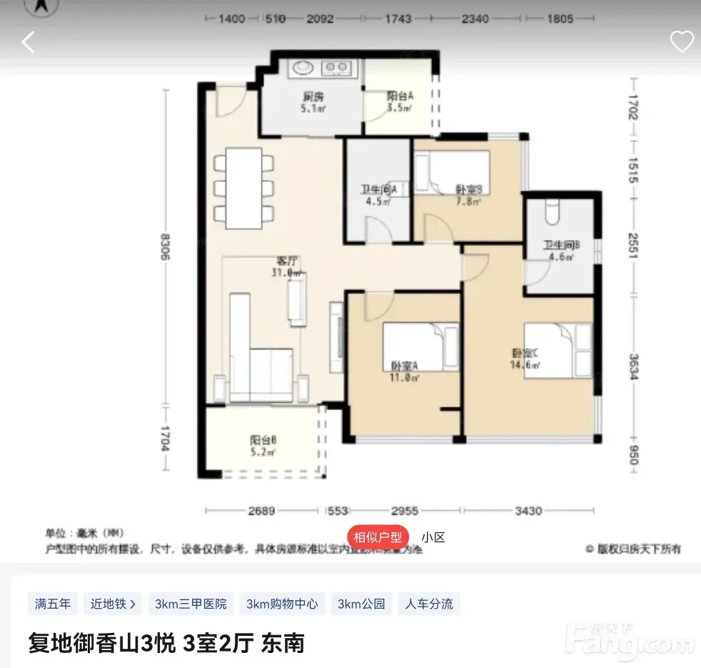 天府新区 复地御香山3悦 3室2厅 99.93㎡ 185万