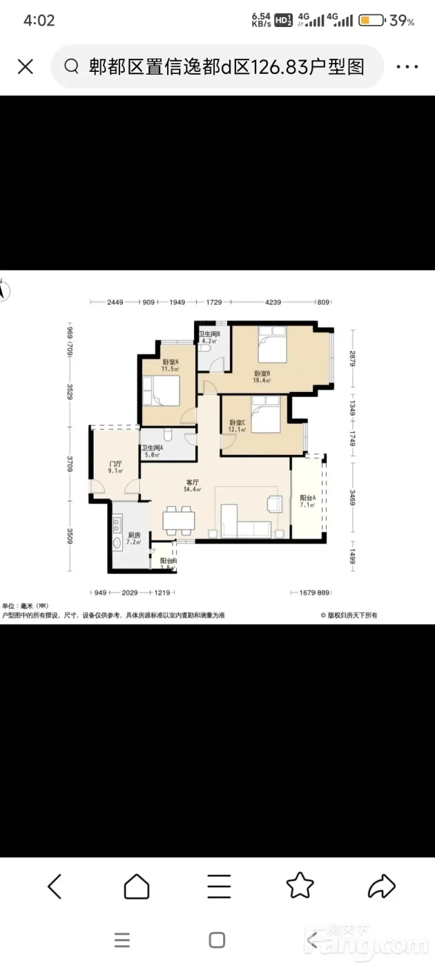 郫都区 置信逸都D区3室2厅 126.83㎡ 105万
