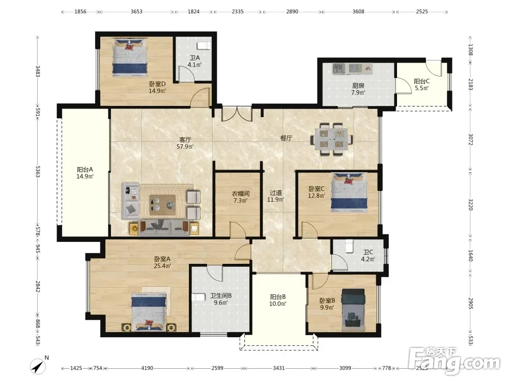 223平米大平层,5房双厅3卫设计,布局合理,采光充足,通透性强,功能分区细腻,使用性和尺度感俱佳
