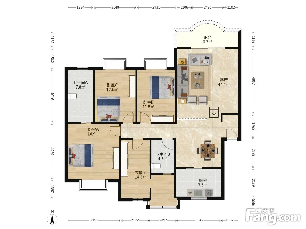 户型齐全,主打明厨,独立衣帽间,明卫,双阳台三居