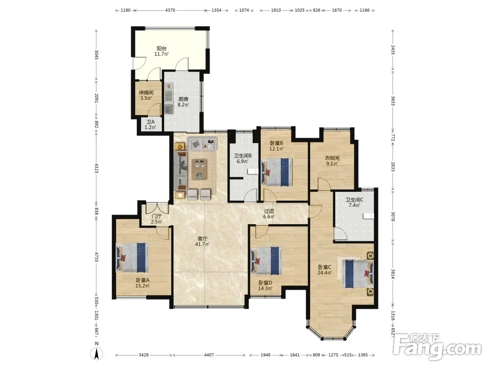 房子是正南朝向目前是四个卧室加衣帽间户型方正每个房间都比较大而且有保姆间带卫生间公摊小