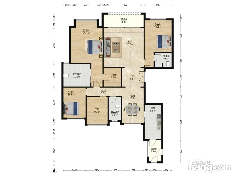 户型齐全,主打明卫,明厨,独立衣帽间,双阳台三居