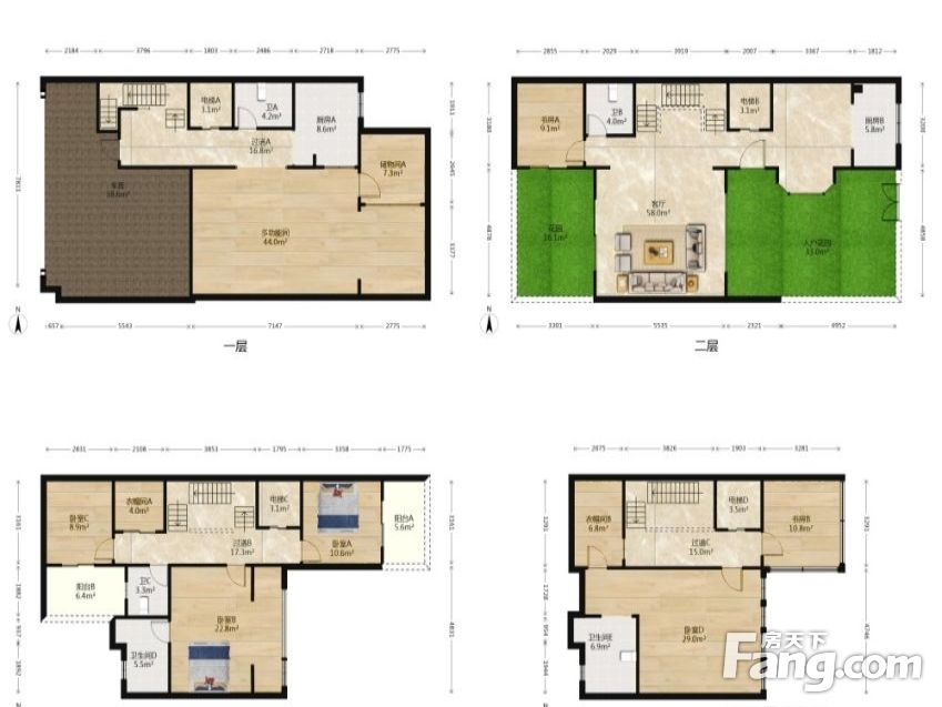 房子一共3层 加个负一楼 有5个房间 负一楼有1个车库可以停2个车