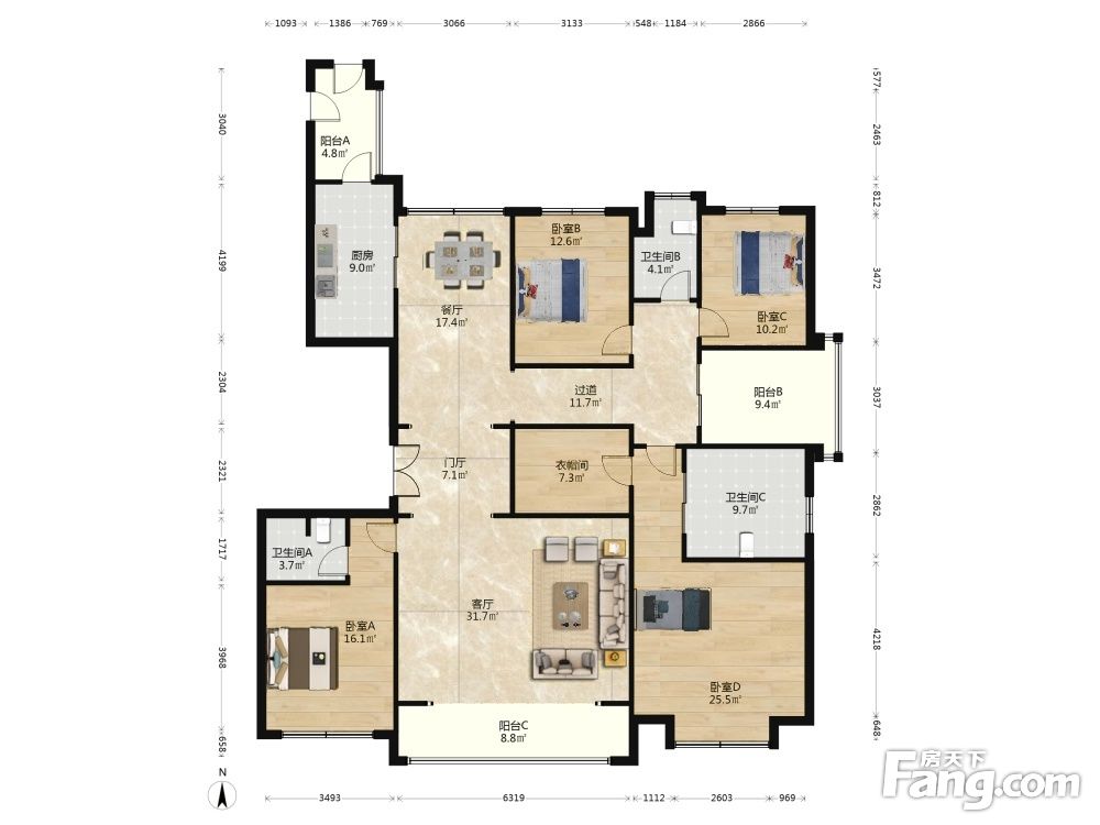户型齐全,主打明卫,明厨,独立衣帽间,双阳台三居