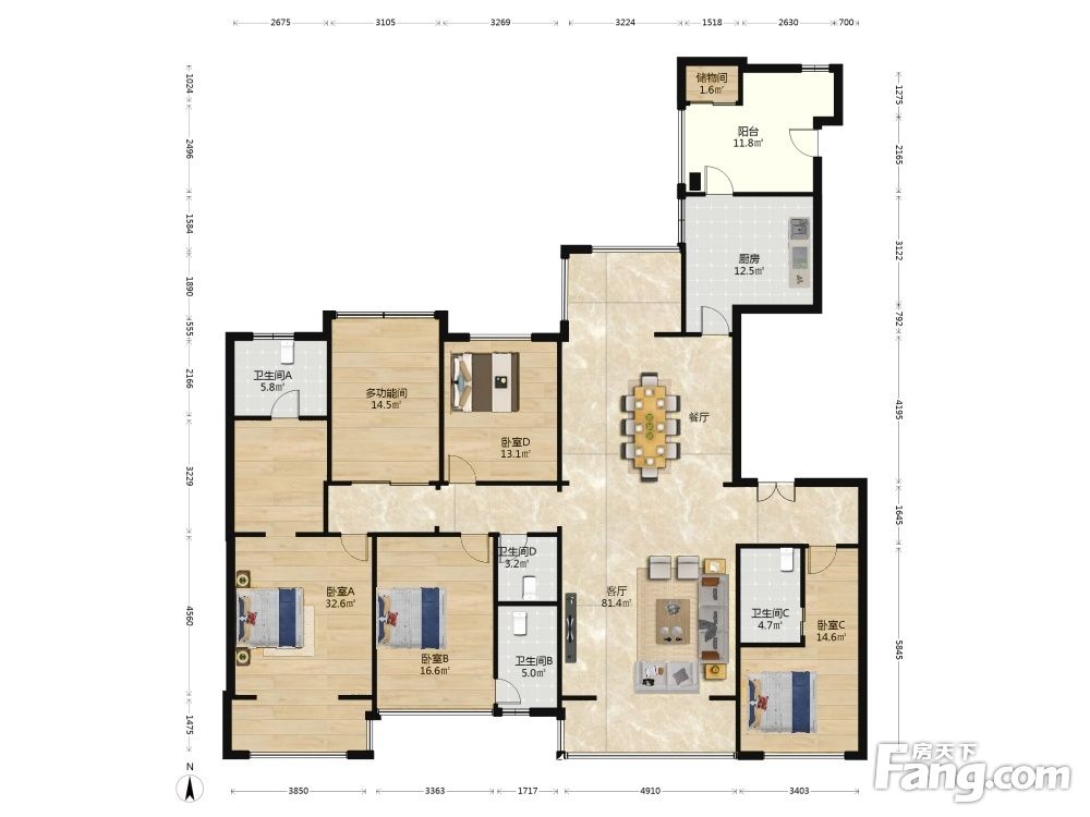 户型齐全,主打明卫,明厨,独立衣帽间,客厅朝南,全明格局四居