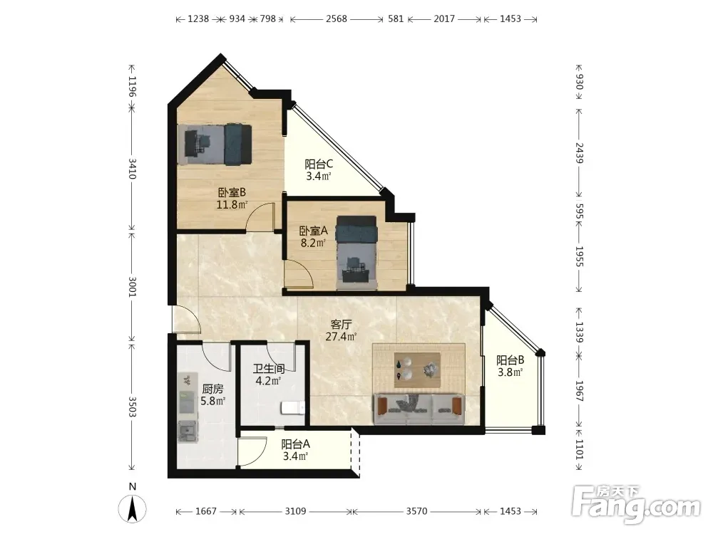 户型齐全,主打明卫,客厅朝南,双阳台三居