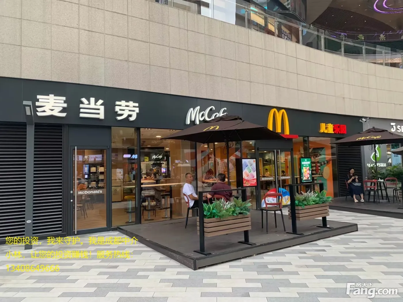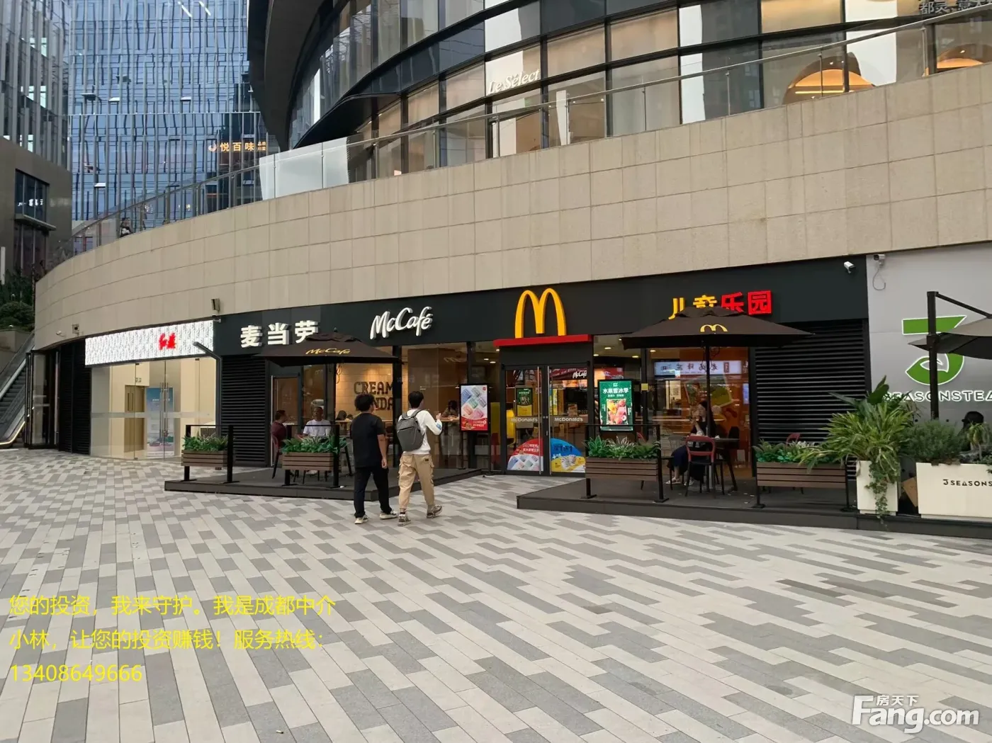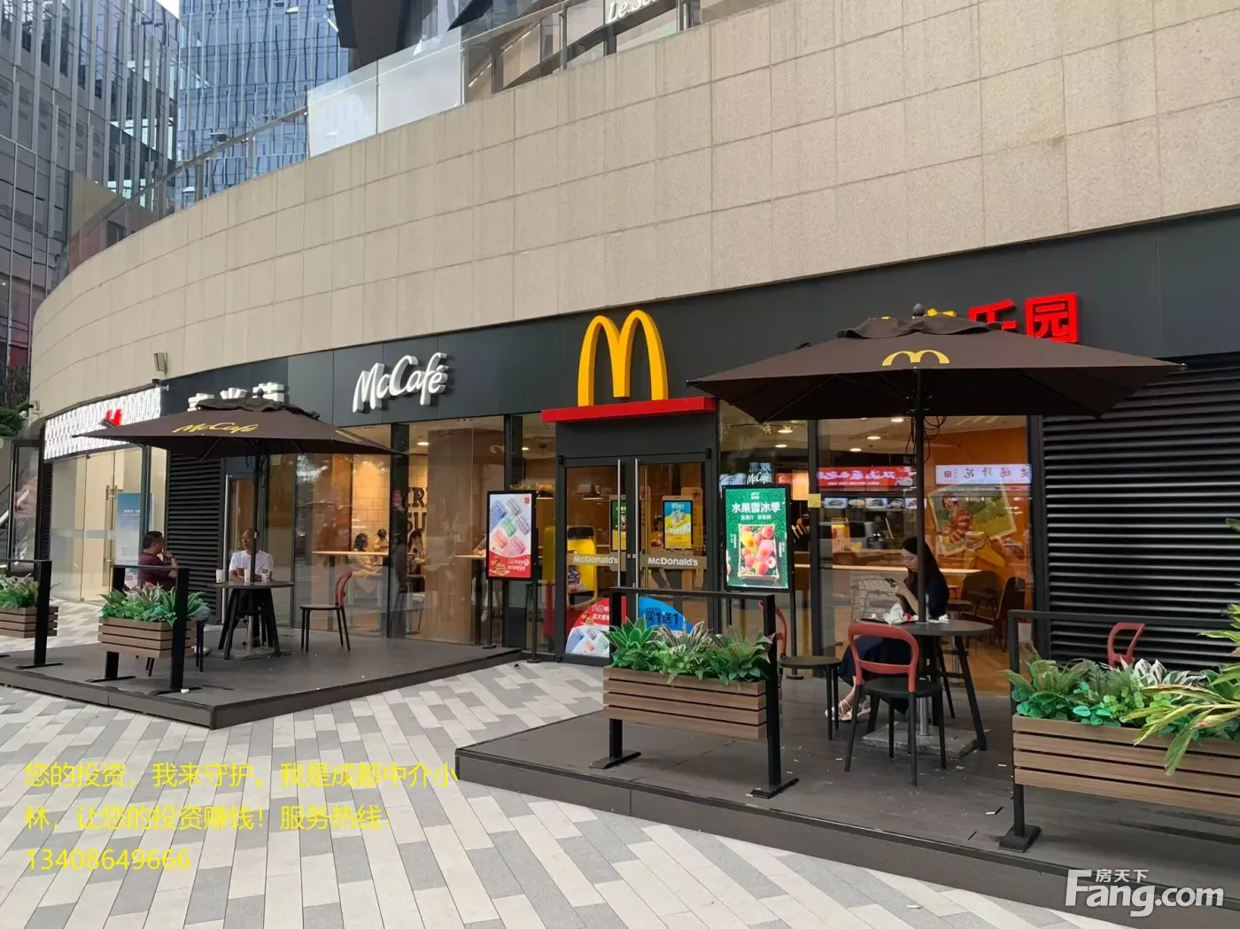 《用心深耕蓉城商业十一载,专业诚信,客户至上》 商铺信息—————— 【面积】 88.67㎡ 【总价】 280万 【目前经营业态】麦当劳 【租金】 25万 【租约】租约5年,第三年开始递增5% 【抵押状态】证件齐全,无抵押、 【商铺优势概括】 1.位于城南高新区核心居住区,周边商业氛围浓厚。 2.周边全是高端成熟大型小区,高端写字楼办公人群。 3.铺子大开间,昭示性强,展示面非常大,户型方正, 4.铺子租给大型连锁商家,租金有保障,稳定。