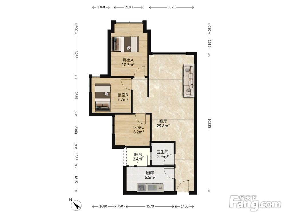华润凯旋天地,只有两个户型,59平的套二,以及79平的套三。79平小套三,有ABC三种户型,其中本套房源是为方正的套三户型。