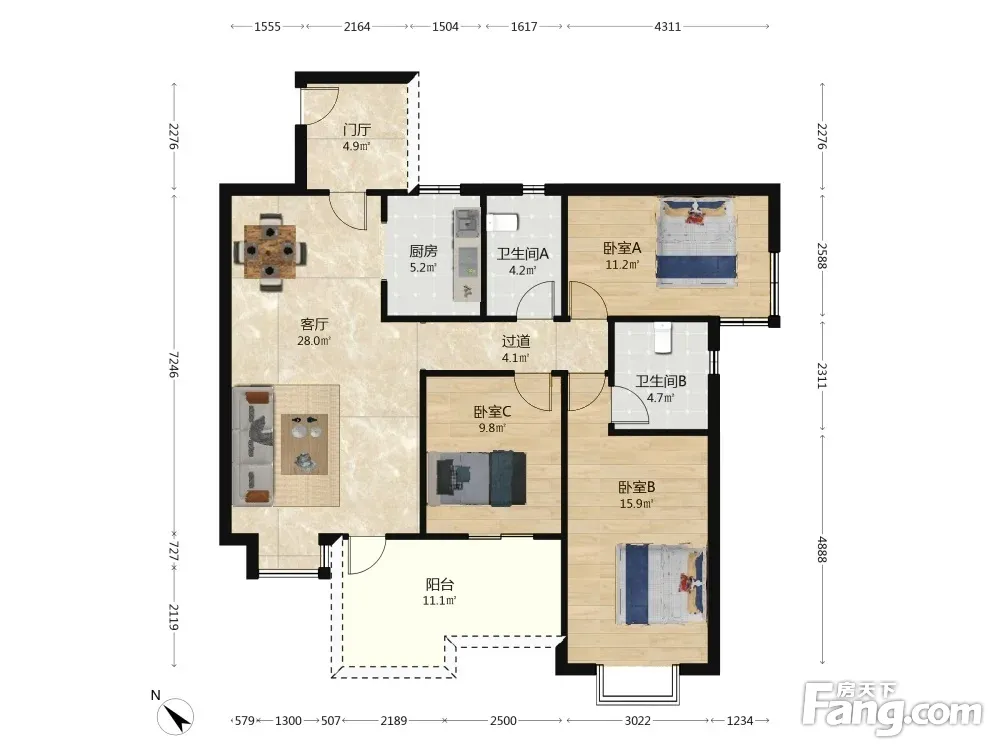 户型齐全,主打户型方正,独立衣帽间,明厨,明卫,客厅朝南三居