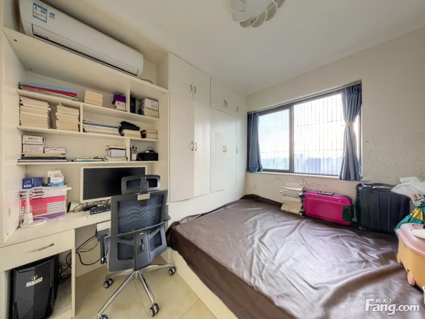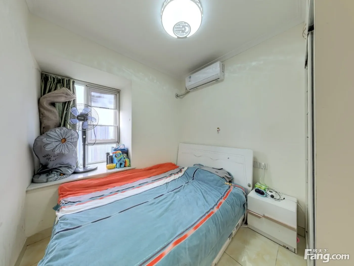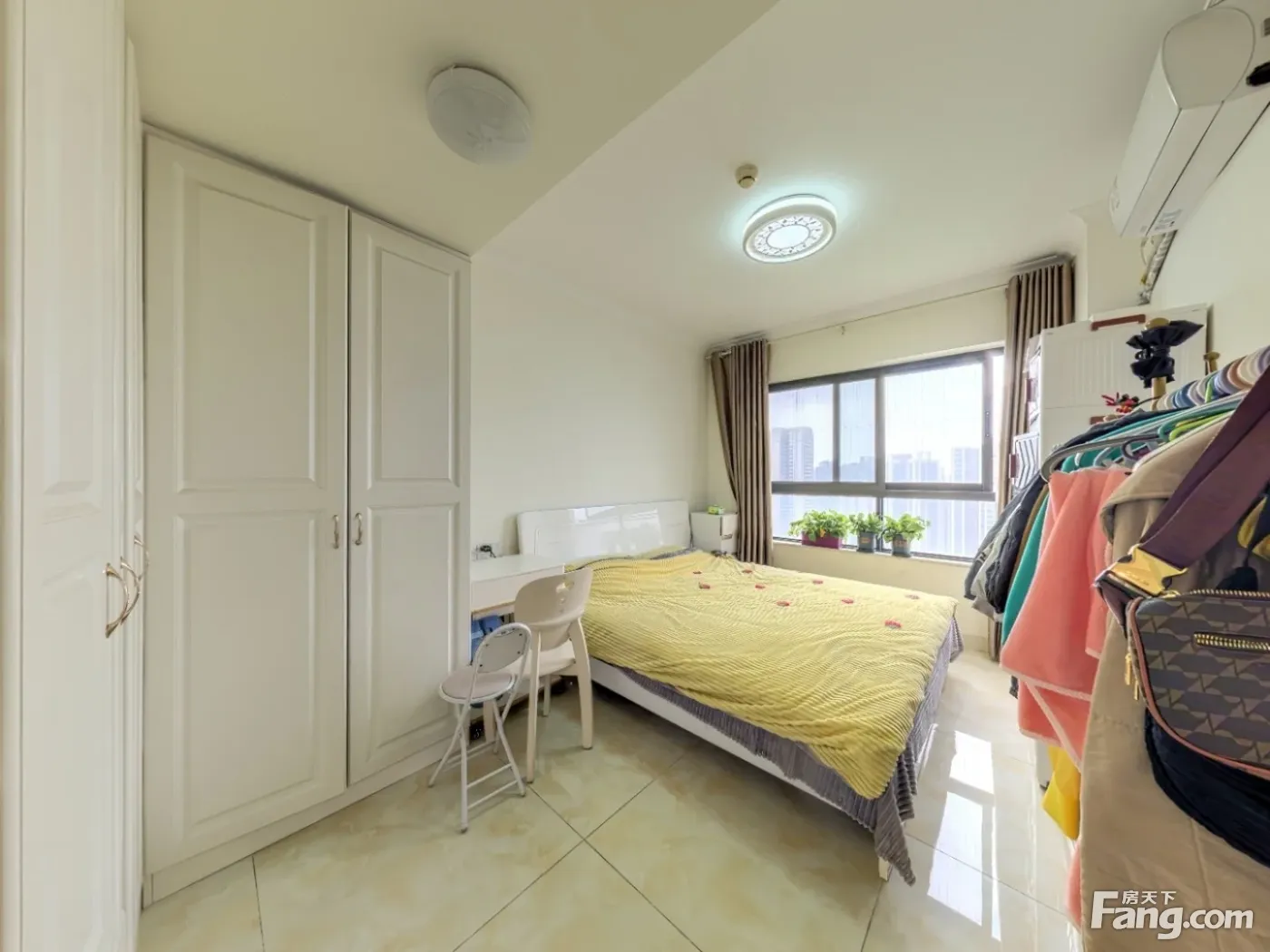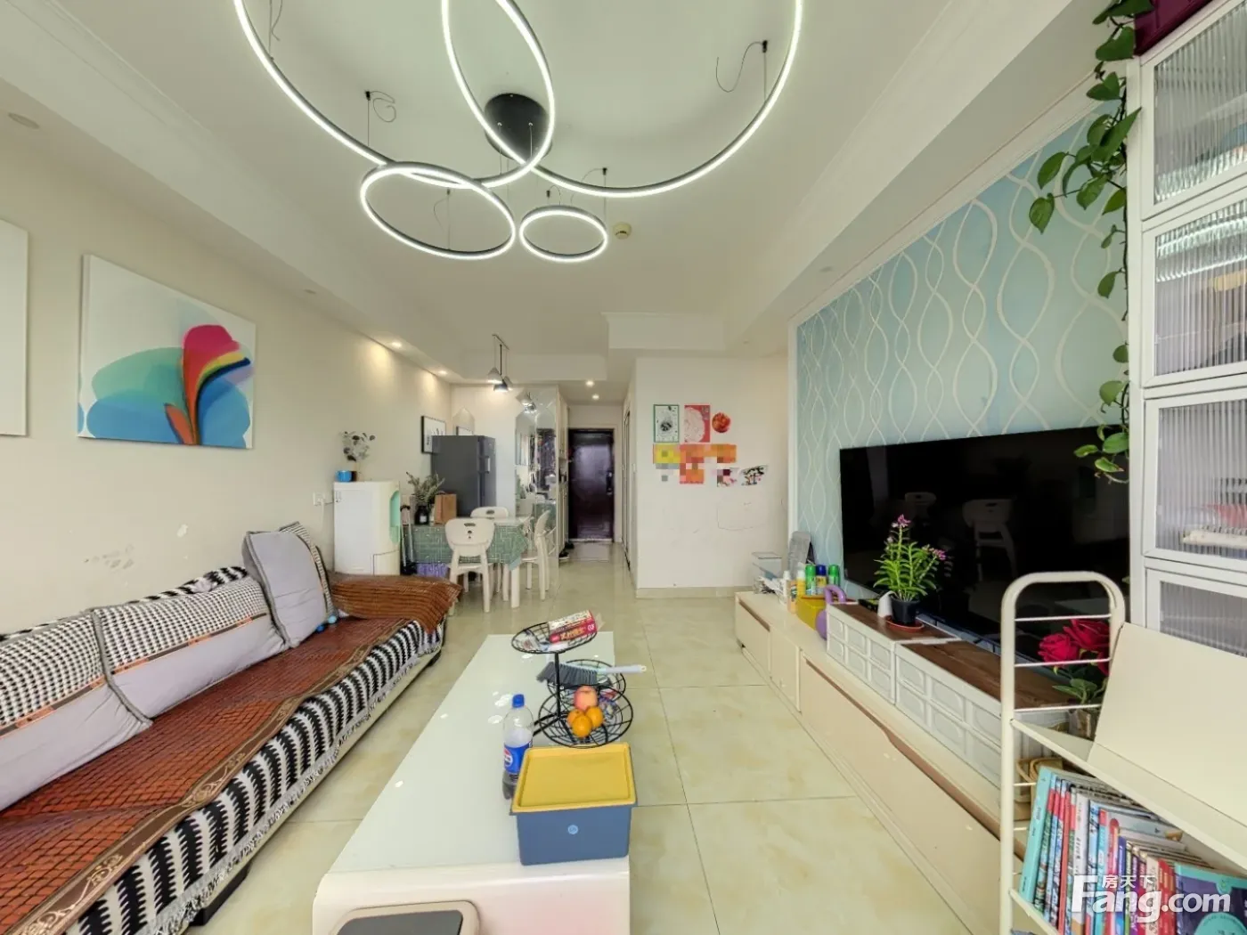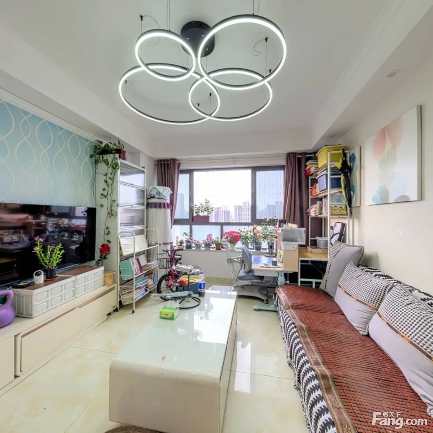标准的套三户型,客厅是全面采光。主卧敲掉卫生间做了衣帽间,整体的卧室空间更大更舒服。整体为西南朝向,看华熙528艺术村方向,下午阳光照进客厅的茶几上,采光和视野很好。