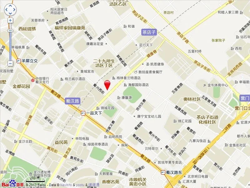 皇冠假日酒店、洲际酒店、费尔蒙酒店餐饮:俏江南、港莉茶餐厅、蜀缘快乐餐厅、尊尚牛排、土碗香、乐天美食街商场:欧尚、宜居、迪卡侬、伊藤、百货、美美力诚旗舰店、奥斯莱特购物中心、中航时尚购物中心,银泰城购物中心(银行:中国银行、工商银行、光大银行、中信银行、兴业银行、农业银行、建设银行、进出口银行医院:成都市人民医院、华