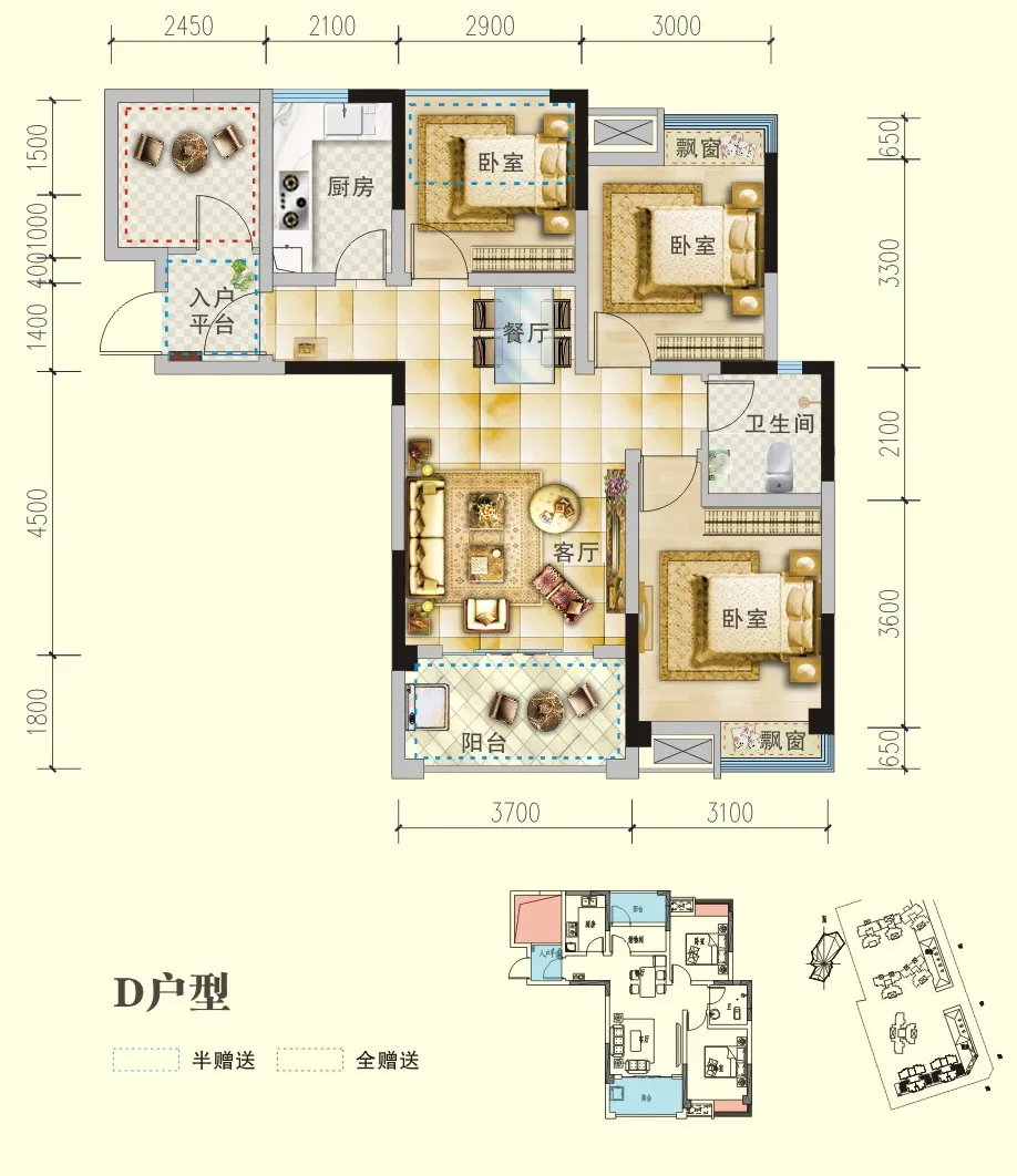 户型齐全,主打户型方正,明卫,明厨,独立衣帽间三居