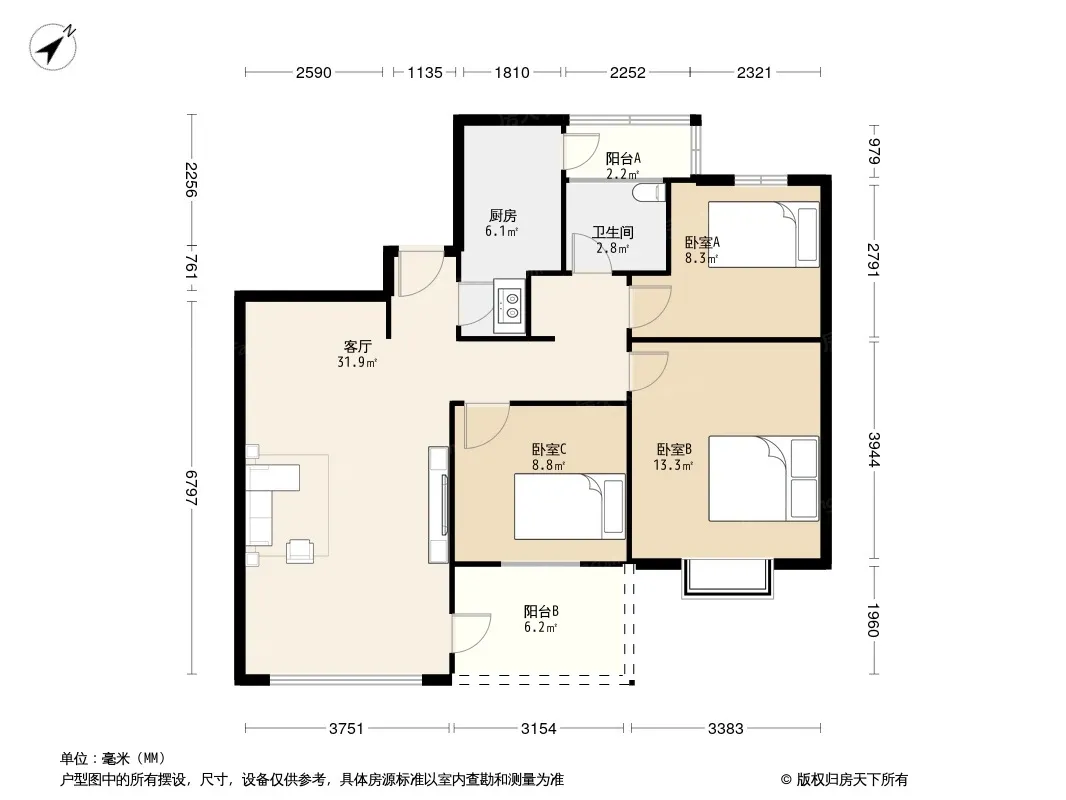 户型齐全,主打户型方正,明卫,客厅朝南三居