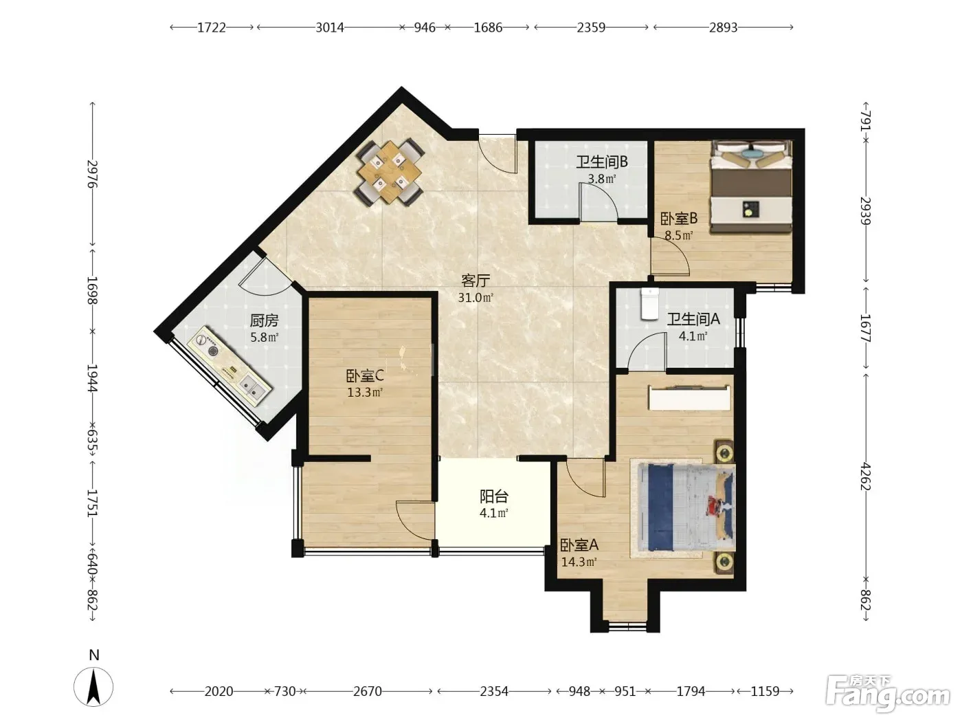 户型齐全,主打客厅朝南二居