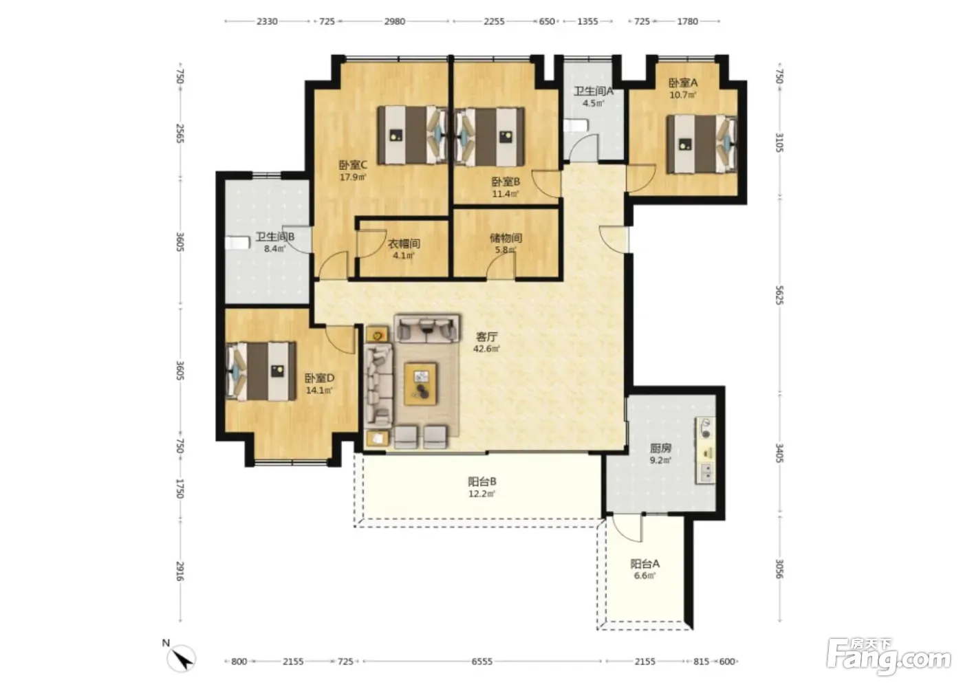 户型齐全,主打独立衣帽间,明卫,双阳台四居