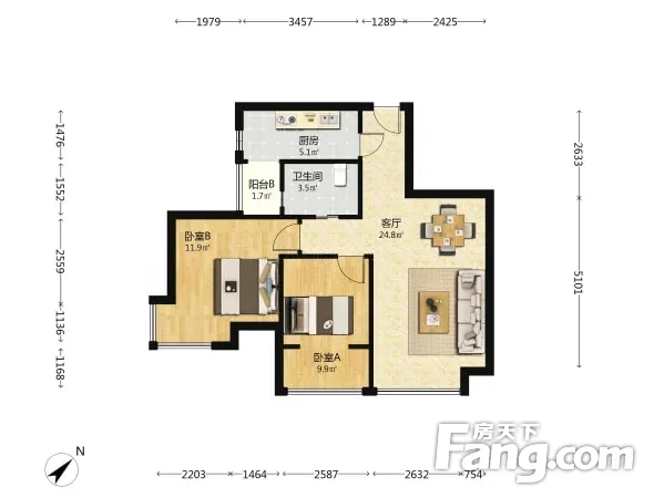 户型齐全,主打明卫,客厅朝南二居