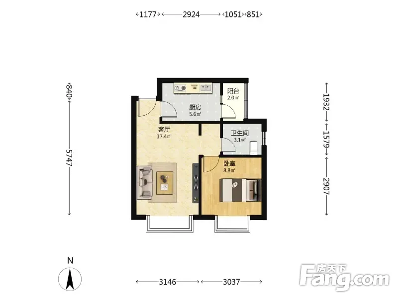户型齐全,主打明卫,客厅朝南,主卧朝南一居