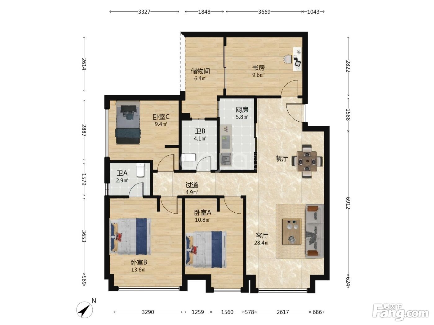 户型齐全,主打观景飘窗,干湿分离三居