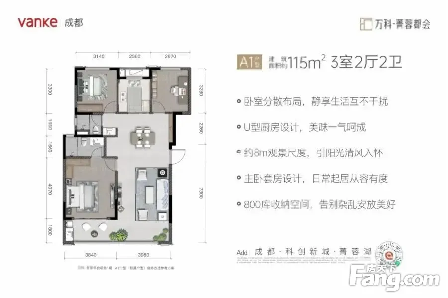 万科·菁蓉都会户型主要有115平-115平的户型方正,动静分离,采光充足,主卧套间,U型厨房,大面宽阳台的三居 、135平-135平的南北通透,户型方正,动静分离,主卧套间,开放厨房,明卫,大面宽阳台的四居 。