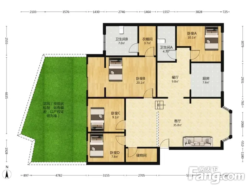 核心精装修,有垫高,错层,大套四带45平花园看房方便 小区介绍小区是2002年建成交房,总共7栋,有架空车位,绿化环境不错,正大门门口带小型市政公园,共7层,小区保安24值守,刷卡进入,物业费0.9元/㎡ 户型介绍房子是套四的,南北朝向,主卧室带卫生间,有储物间,又休闲厅可当工作室及小孩玩耍,独立的餐厅区域,带42平的私家花园 周边配套小区门口就有水果chao市和舞东风,小区背后就是紫荆美熙广场,买菜很方便,820米就是地铁5号线和7号线,1.3公里就是地铁1号线(来自百度地图)