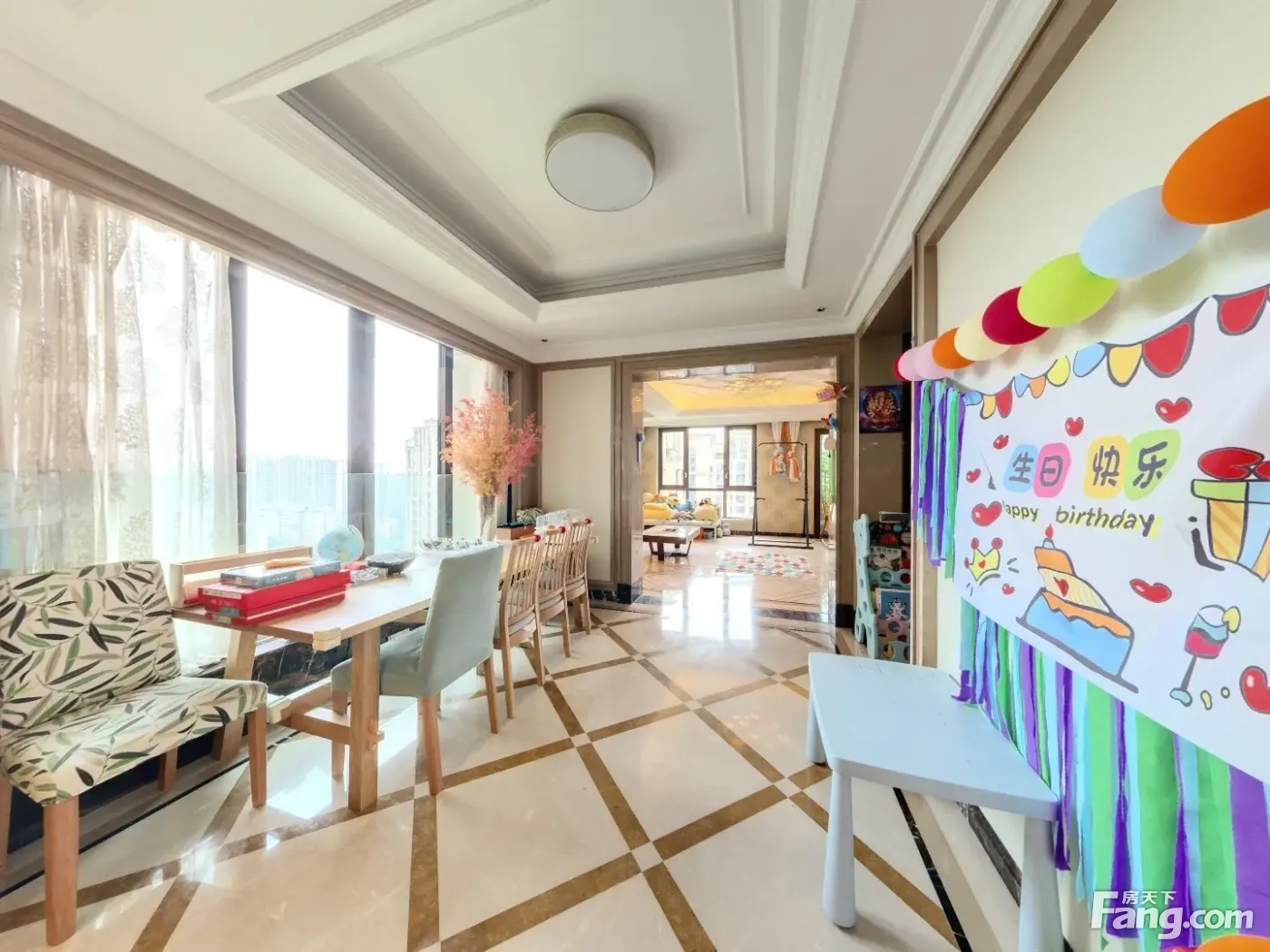 核心此房是开发商7500元每平的精装修标准,270°采光,好楼层 小区介绍小区是华润地产开发,华润金钥匙级物业服务,物业费4.6元一平。整个小区5个中庭,4个大门,占地168亩,地下两层停车位,车位配比1:2.3,23栋住宅,1栋业主会所,每个单元均有小区管家进行服务。 户型介绍房子是进门带入户门厅,出电梯就是自己的门厅,分大门和侧门入户。此房有4个卧室+书房+保姆间,分中西厨房,有早餐厅和主餐厅,客厅旁带多功能厅,布局都是可以根据自己的需求进行改变。整个房子270°采光,做了干湿分区和动静分区,布局合理。 周边配套商场:西单商场,青羊万达公园:黄忠公园,金沙滨河公园,苏坡公园,摸底河公园医院:成都市第*骨科医院规划:地铁线路27号线(在建),市政府规划的大型生态公园百仁公园(在建) 装修描述开发商统一HaoHua装修,地暖,ZhongYang空调,石材实木大理石拼花,墙纸业主更换过,保养新可领包入住。全对中庭,梯控设置,隐私好,动静分区明显。