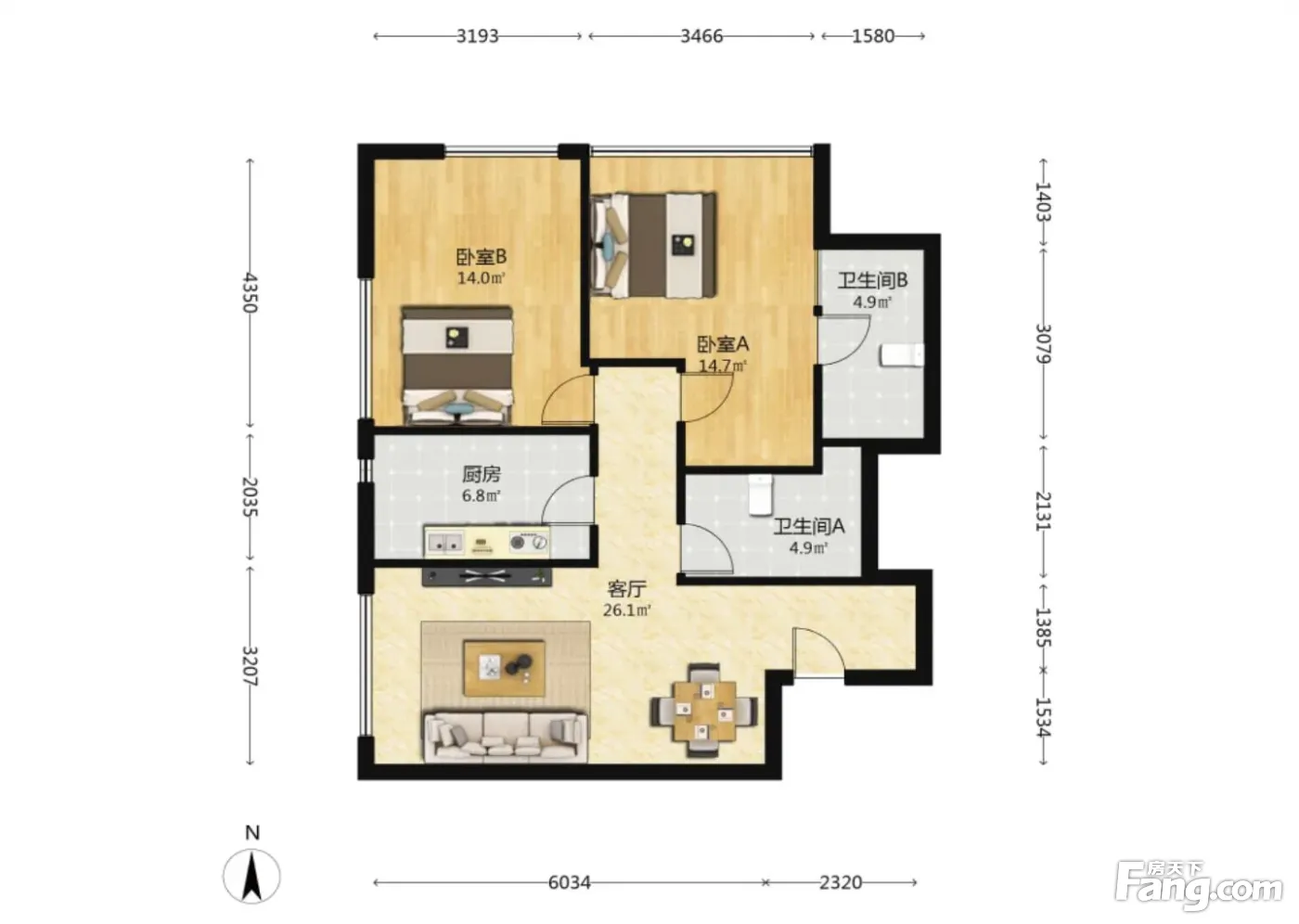 户型齐全,主打明厨,客厅朝南,双卧朝南二居