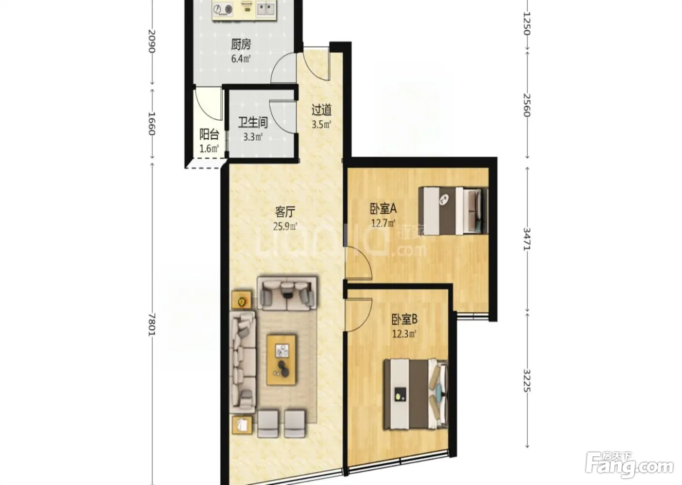 郫县百伦广场 2室1厅1卫 普通装修 53.8万元