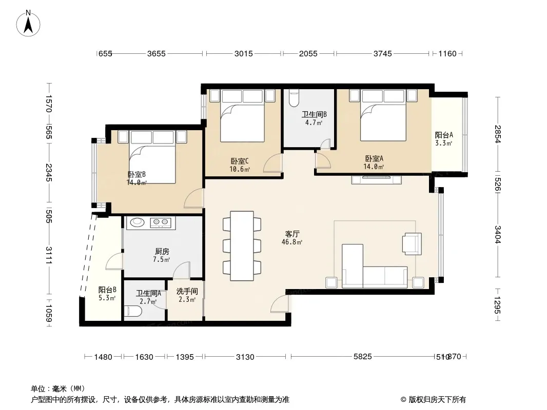 户型齐全,主打明卫,客厅朝南,双阳台三居