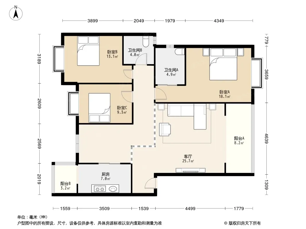 户型齐全,主打户型方正,明卫,明厨,客厅朝南,全明格局,双阳台三居