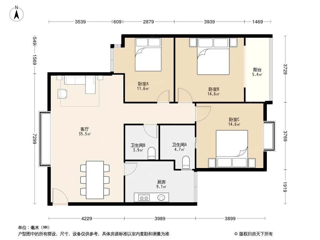 户型齐全,主打明卫,客厅朝南,双阳台三居