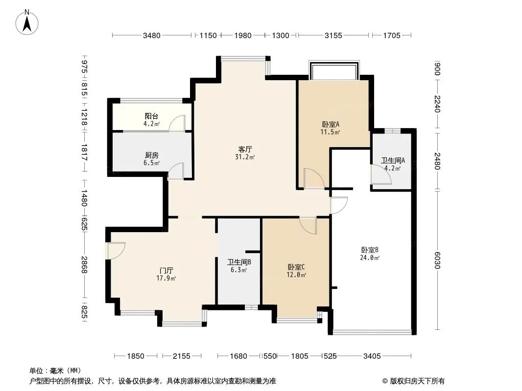 户型齐全,主打户型方正,明卫,独立衣帽间,客厅朝南,双阳台三居
