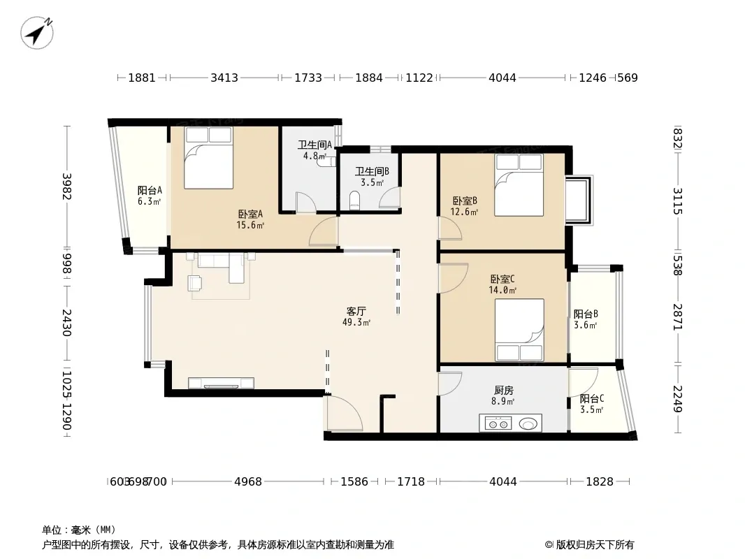 户型齐全,主打客厅朝南三居