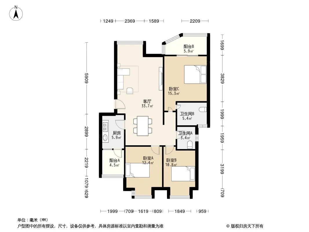 户型齐全,主打客厅朝南,双阳台三居
