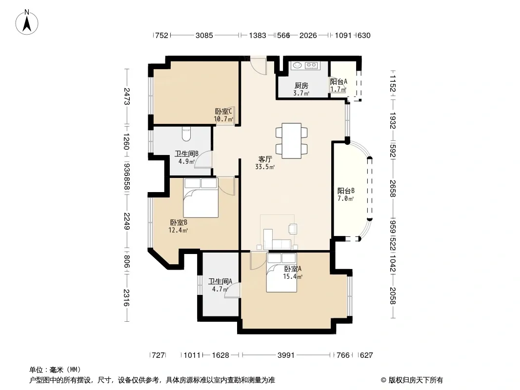 户型齐全,主打明卫,客厅朝南,双阳台三居