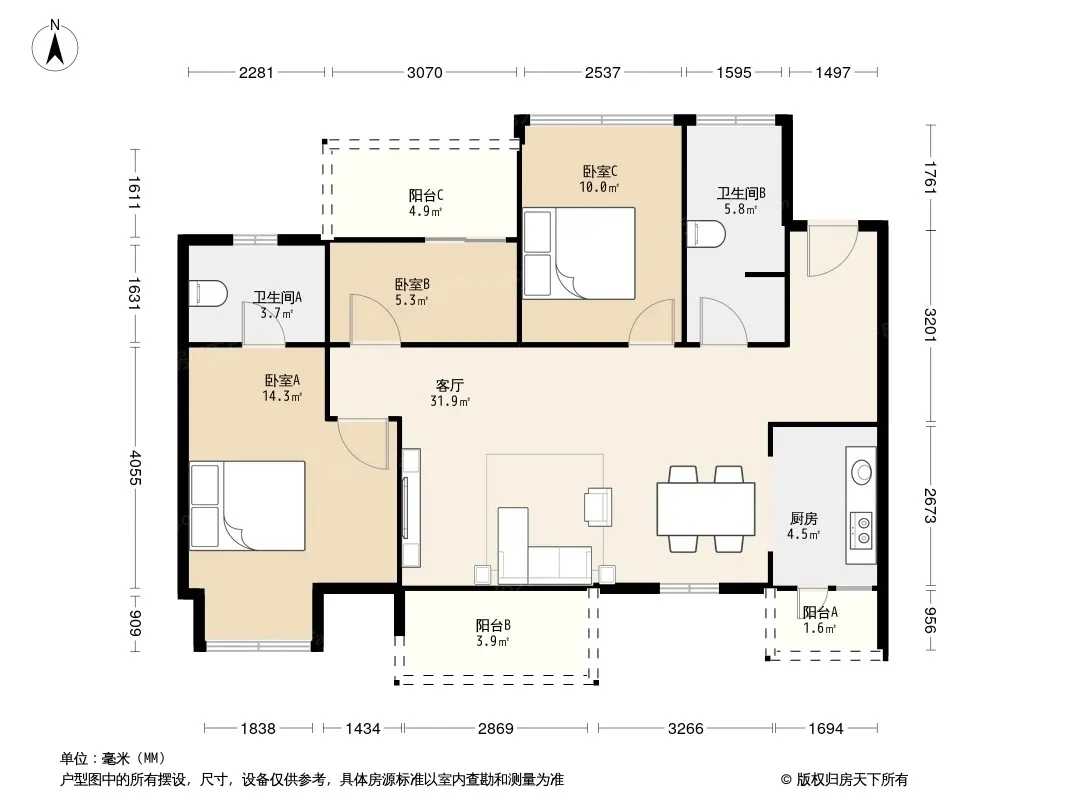 户型齐全,主打明卫,明厨,客厅朝南,全明格局,双阳台,主卧朝南三居