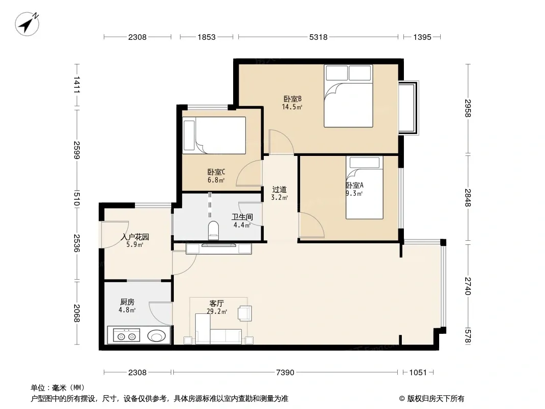 户型齐全,主打客厅朝南三居