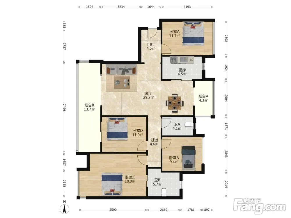 户型齐全,主打户型方正,主卧带卫,大面宽阳台四居