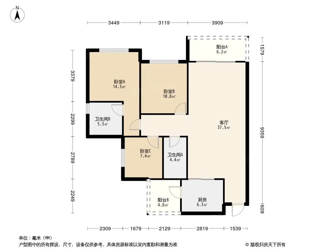户型齐全,主打全明格局,户型方正三居