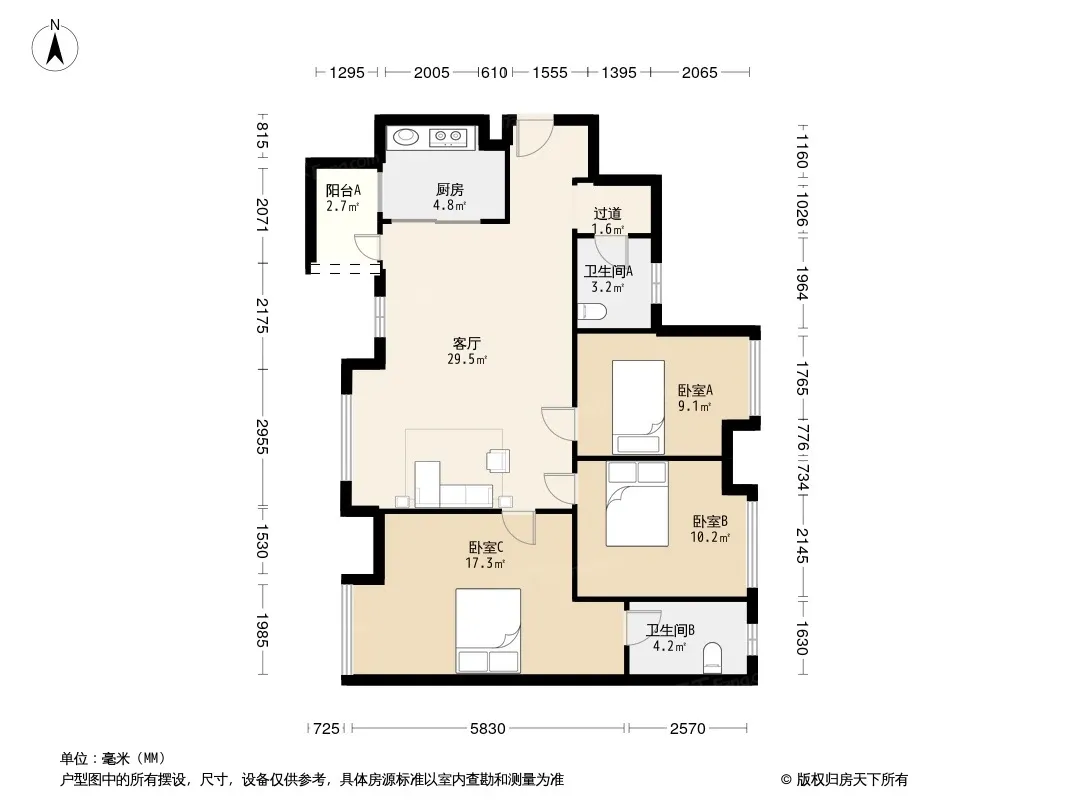 户型齐全,主打明厨,客厅朝南,双阳台,明卫三居