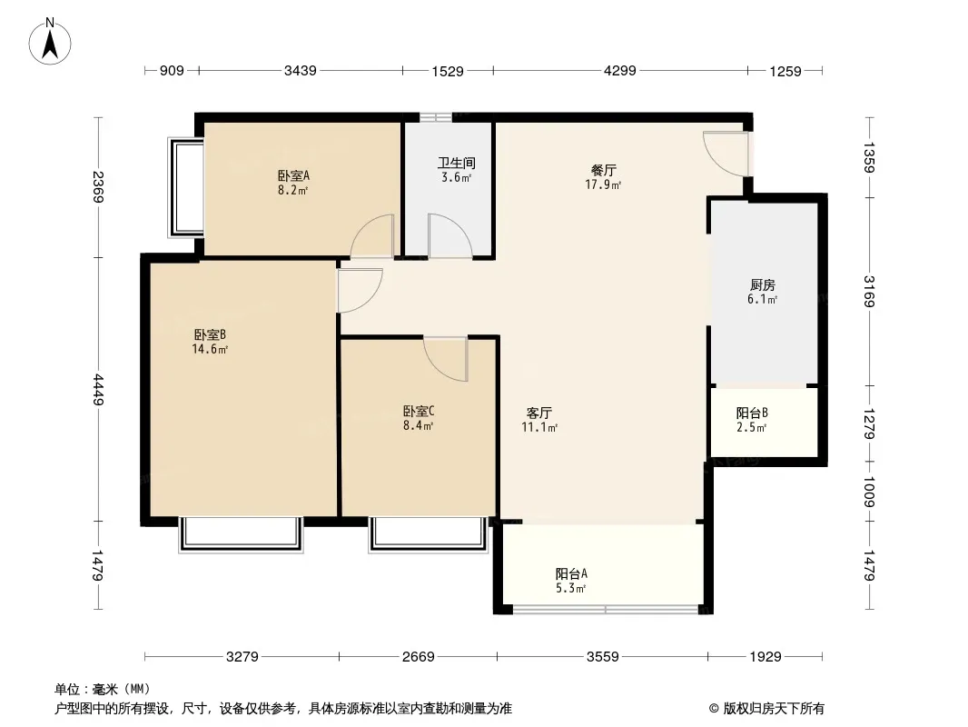 户型齐全,主打动静分离,采光充足三居