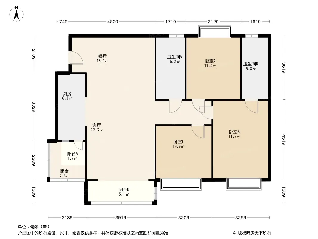 户型齐全,主打动静分离,采光充足三居