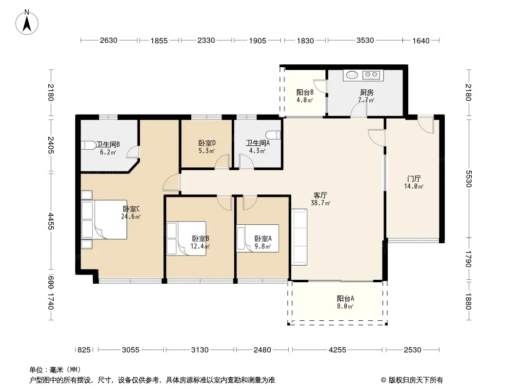 户型齐全,主打户型方正,明厨,明卫,客厅朝南,双阳台四居