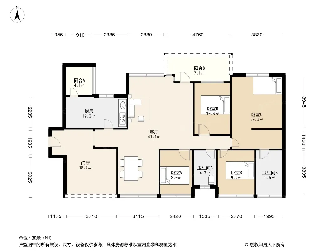 户型齐全,主打户型方正,明厨,明卫,客厅朝南,双阳台四居