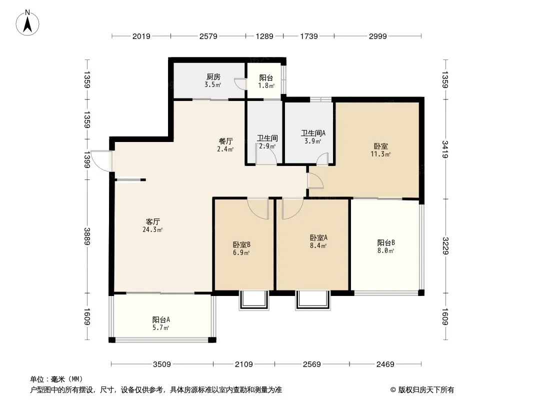 棠湖清江花语 3室2厅 东南